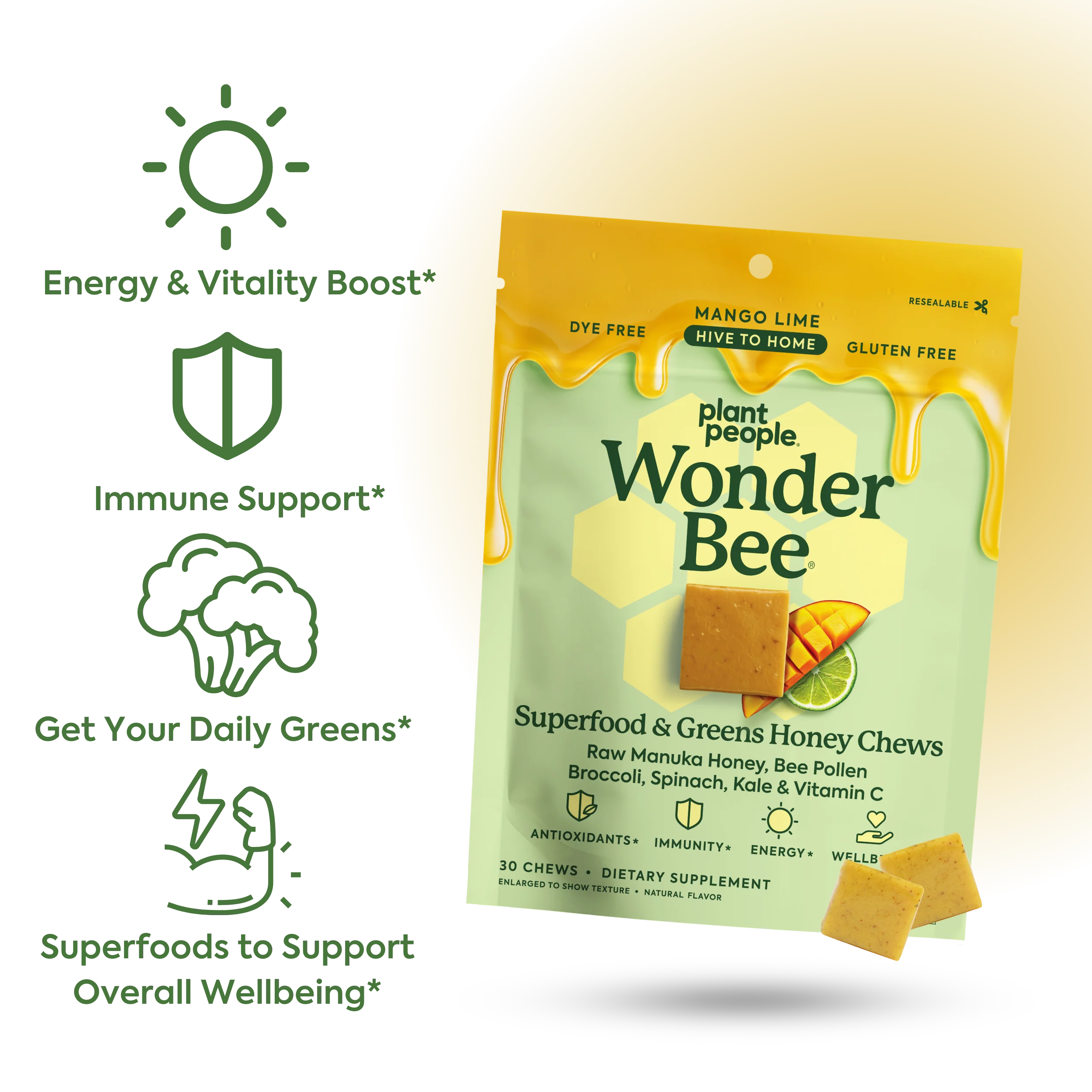 WonderBee® Superfood & Super Greens Honey Chews are delicious, daily superfood and veggie supplements crafted to enhance vitality, support immune health and provide sustained energy.*