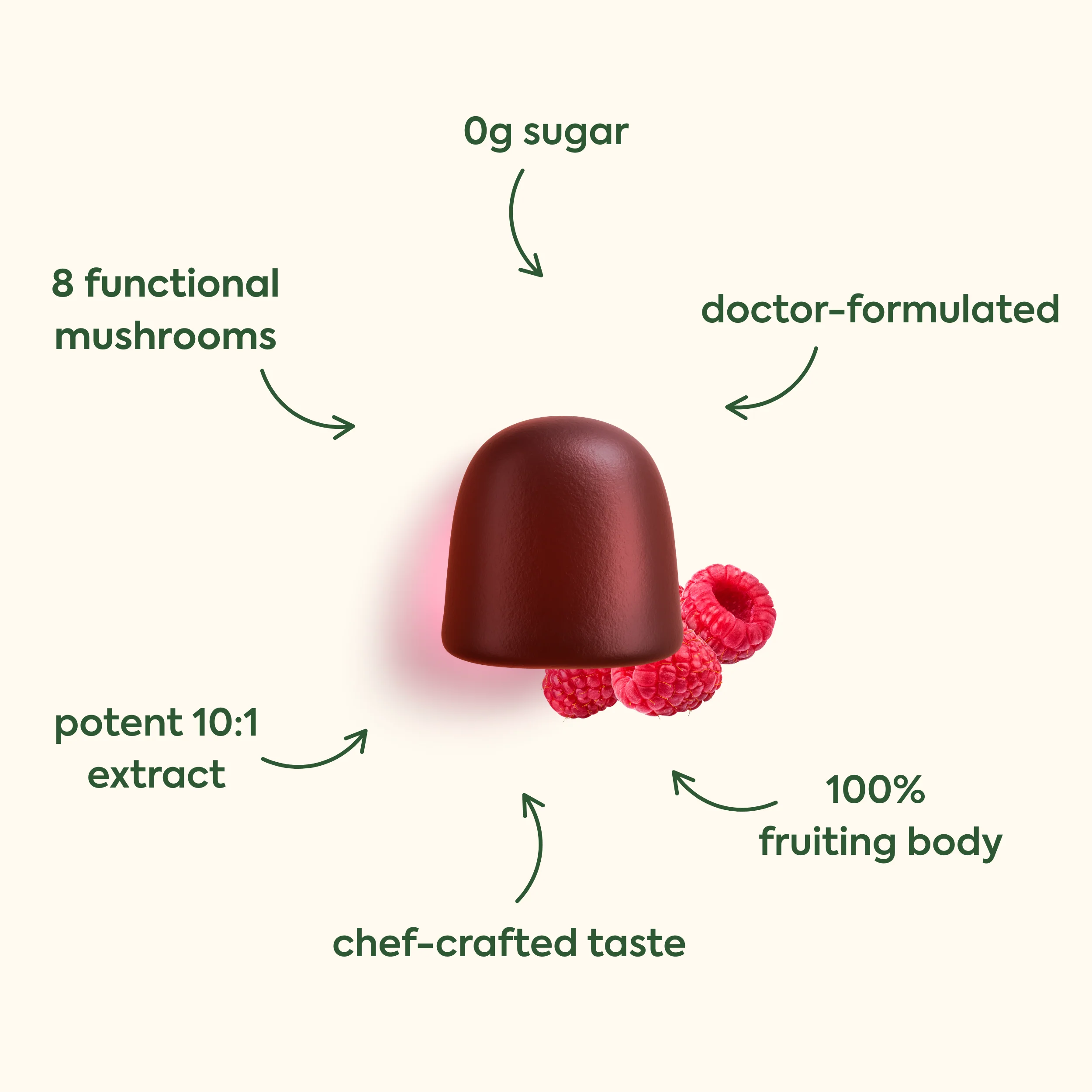 Each serving is a mushroom POWERHOUSE with 8 functional mushrooms. 60 gummies per pouch. 30-day supply.*